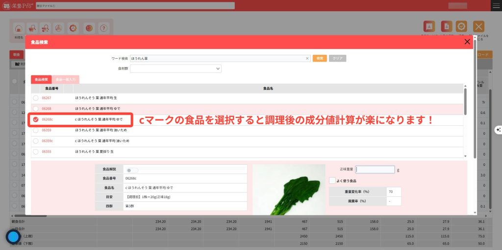 7.レシピの生の重量から調理後の成分値を算出したい場合は、食品名にcマークのある食品をご活用ください。