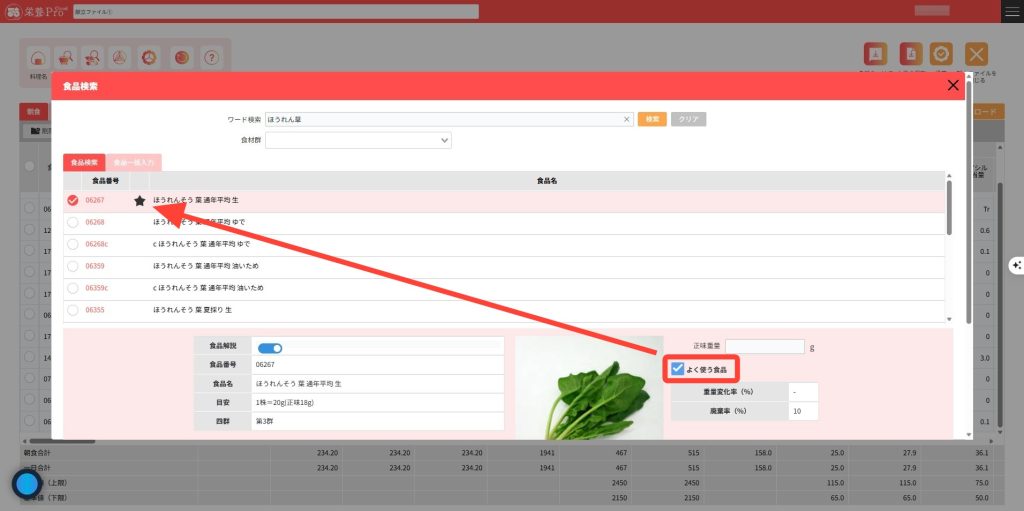 5.正味重量の右上の「よく使う食品」をチェックすることで食品検索結果の優先順位を変更できます。頻繁に利用する食品を「よく使う食品」に設定して活用してください。