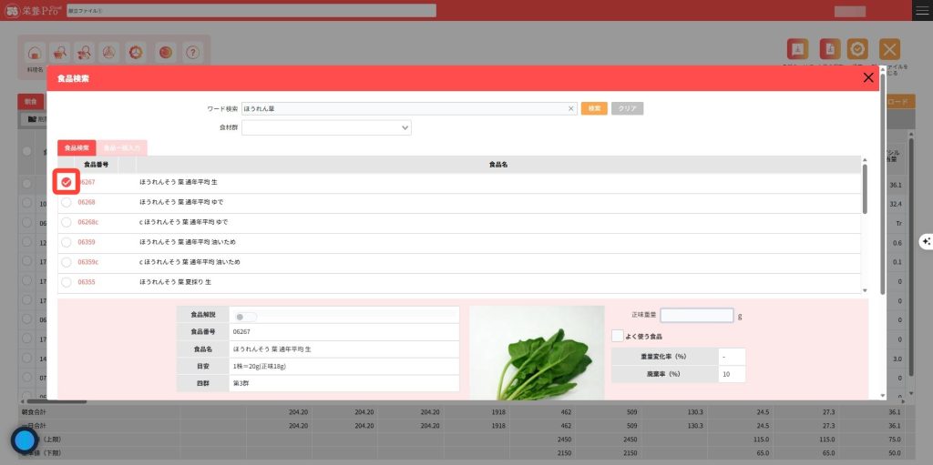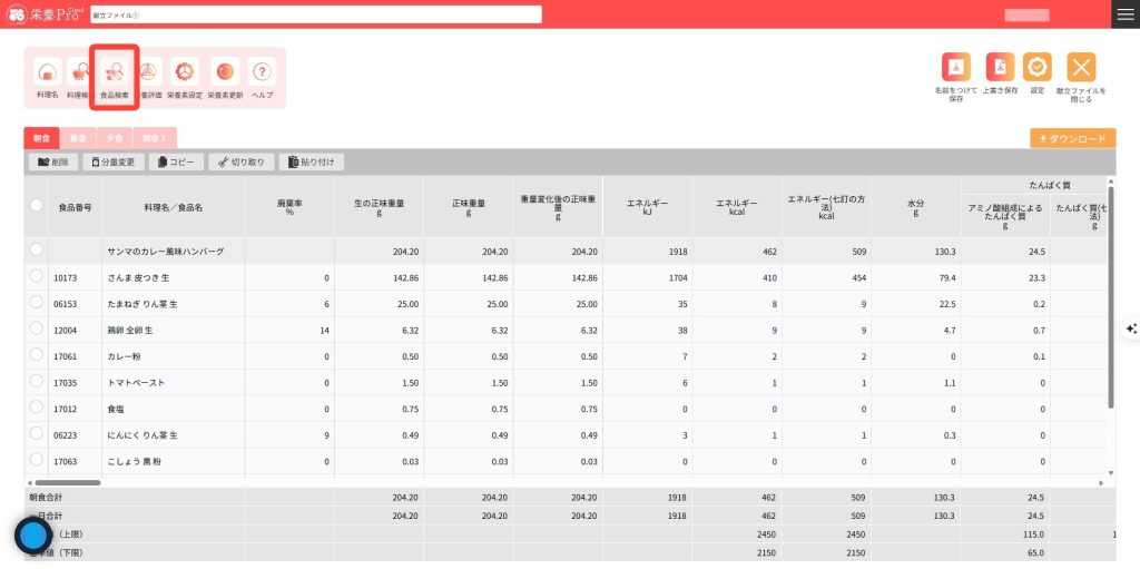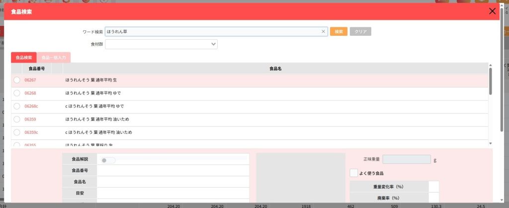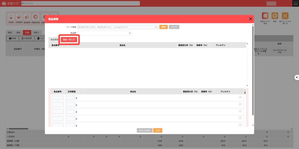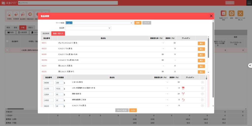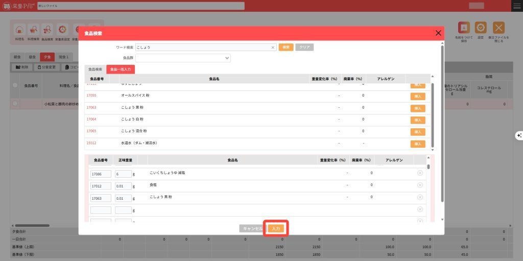 食品を検索し献立編集画面に入力します。
