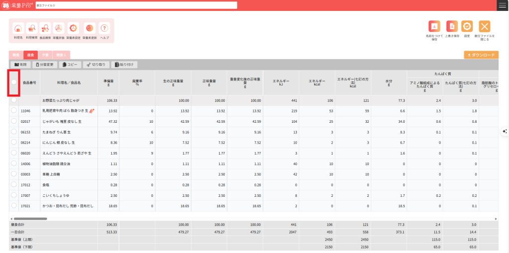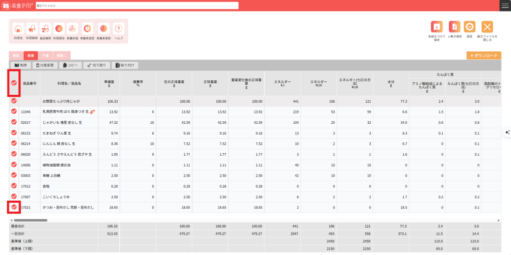 18.栄養素ヘッダーの「料理名/食品名」左横のチェックをクリックした場合、食事区分内のすべての料理名、食品がチェックされます。最終行に赤色のチェックがあるので食品は最終行の「かつお・昆布だし」の上に挿入されますので注意してください。