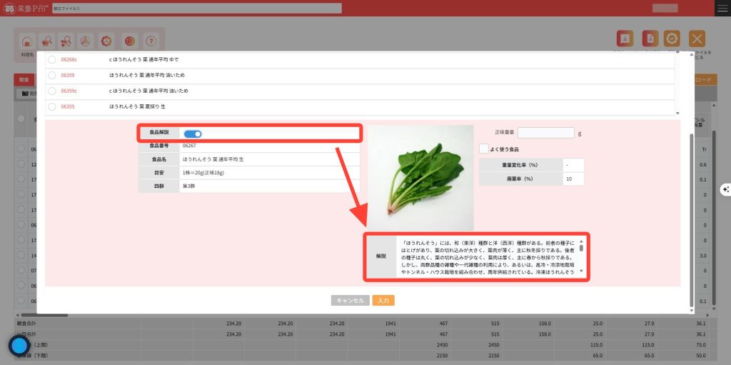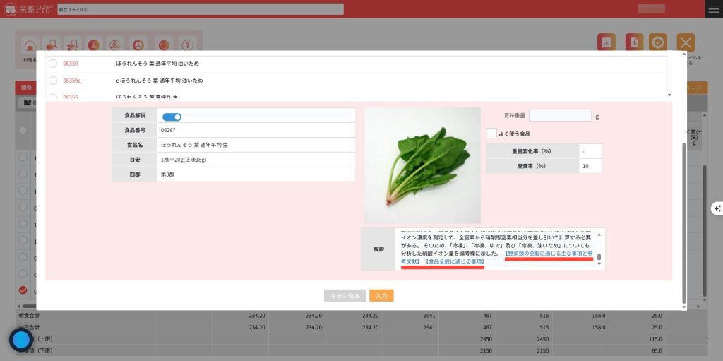 8.右上の食品解説をクリックすると、各食品の留意点をご覧いただけます。