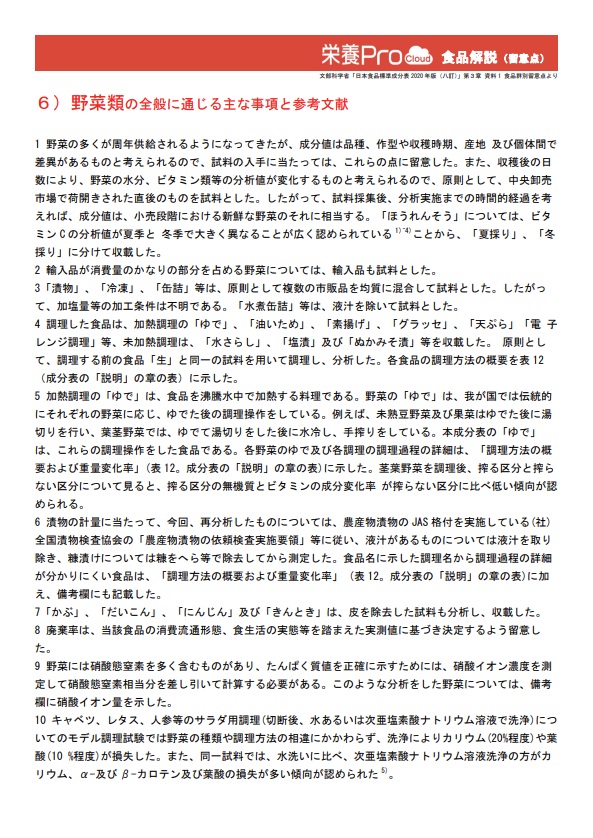 9.「日本食品標準成分表2020年版(八訂)」の食品全般や各食品群全般に通じる主な事項と 参考文献、別表はクリックすることで別画面にて表示されます。