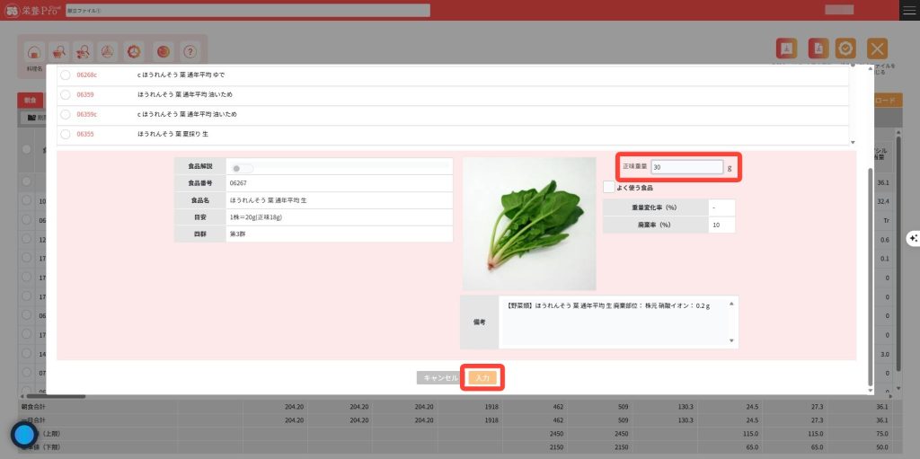 3.正味重量(廃棄部分を除いた口に入る重量)を入力し「入力」をクリックします。正味重量の半角数字のみ入力できます。全角数字では入力できませんのでご注意ください。