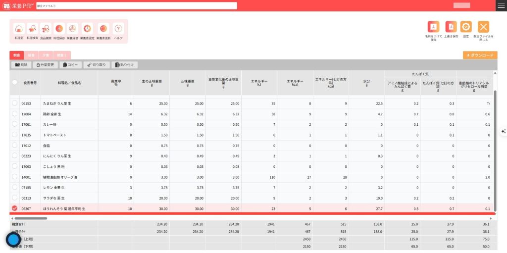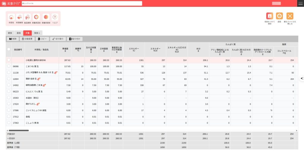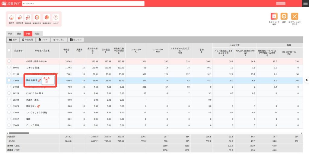4.献立編集画面に食品が入力されます。同じように食品や料理を入力していきます。一つの食事区分に入力できるデータ数は料理名、食品を含め100件以内です。※要確認