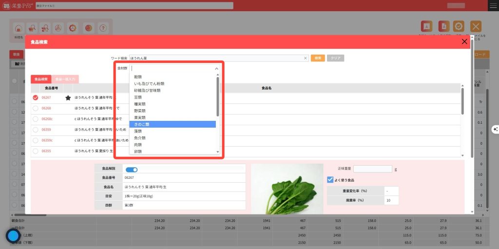 食品群では、食品成分表の18群、四群からも検索できます。ワード検索下部のコンボボックスから目的の食品群を選択してください。