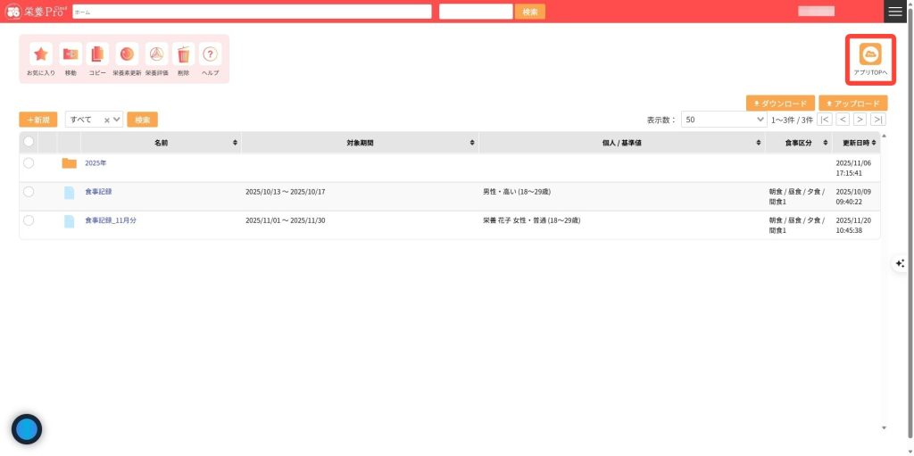 3.右上の「アプリTOPへ」ボタンをクリックすると、ポータル画面に戻ります。編集中の献立は保存されませんので注意してください。