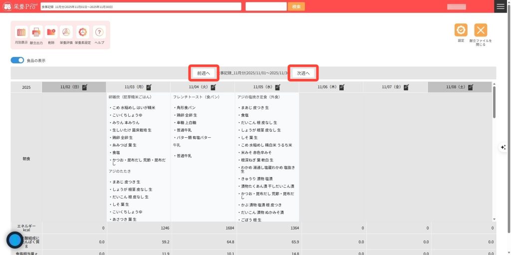 7.前週/次週の登録内容を表示したい場合には、「前週へ」「次週へ」をクリックすると、画面が切り替わります。