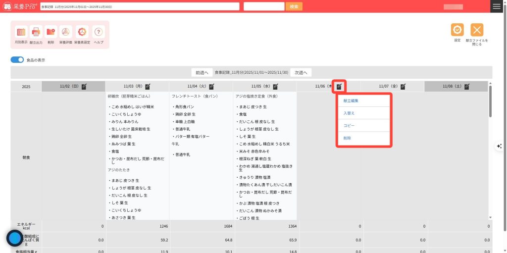 5.日付・曜日横のカレンダーアイコンをクリックすると、メニューを表示することができ、「献立編集」をクリックすると、献立編集画面が表示されます。「入替え」「コピー」「削除」は、各食事区分に登録された内容に実行されます。※これらの操作は、自動で保存されます。