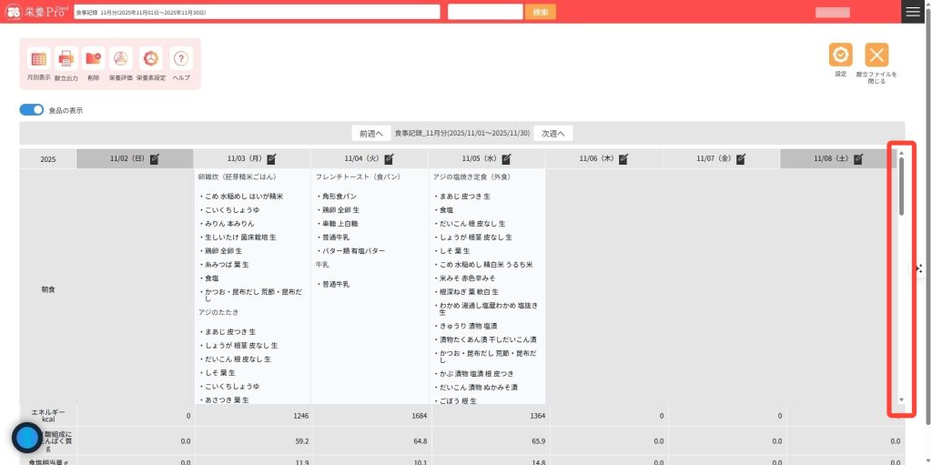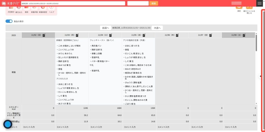 また、画面右の縦スクロールバーをドラッグすると、栄養素およびコメント入力欄を表示することができます。  ※コメントの入力内容は、自動で保存されます。