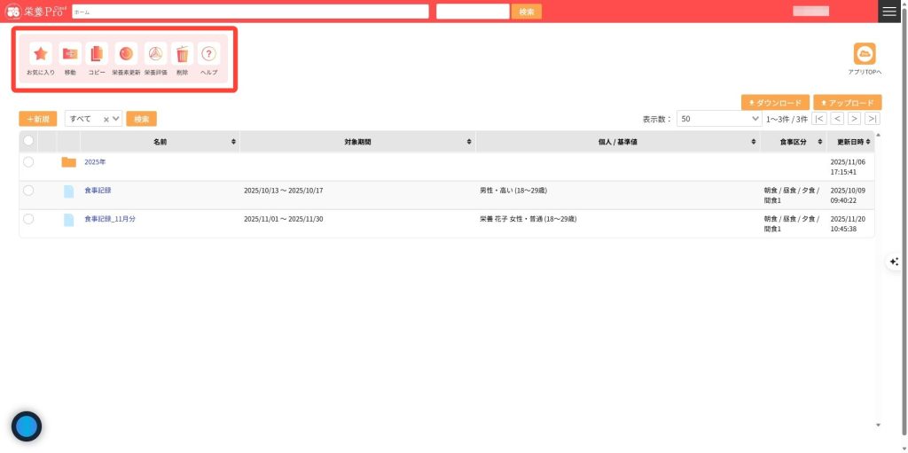 2.メニューアイコンです。「献立管理」に関するメニューが表示されます。主たる機能として編集中の献立ファイルを栄養Proクラウドのクラウドストレージに保存する機能を選択できます。また、編集中の献立を利用中の端末にダウンロードすることもできます。