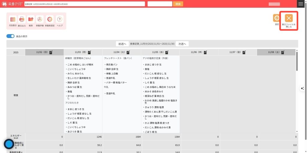 8.複数日献立ファイルを閉じる場合には、右上の「献立ファイルを閉じる」ボタンをクリックします。
