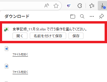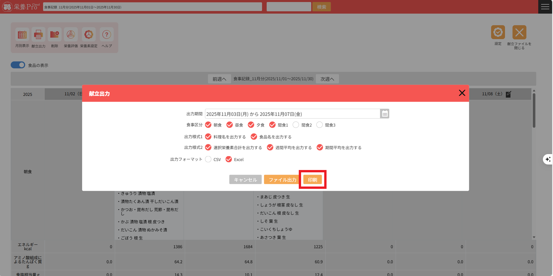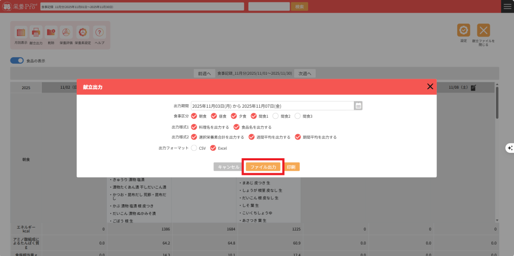 2.ポップアップが表示され、「出力期間」「食事区分」「出力形式1」「出力形式2」「出力フォーマット」の必要条件を選択し、「ファイル出力」を選択します。
