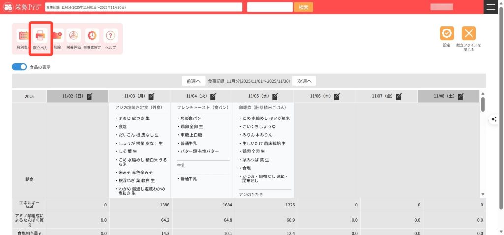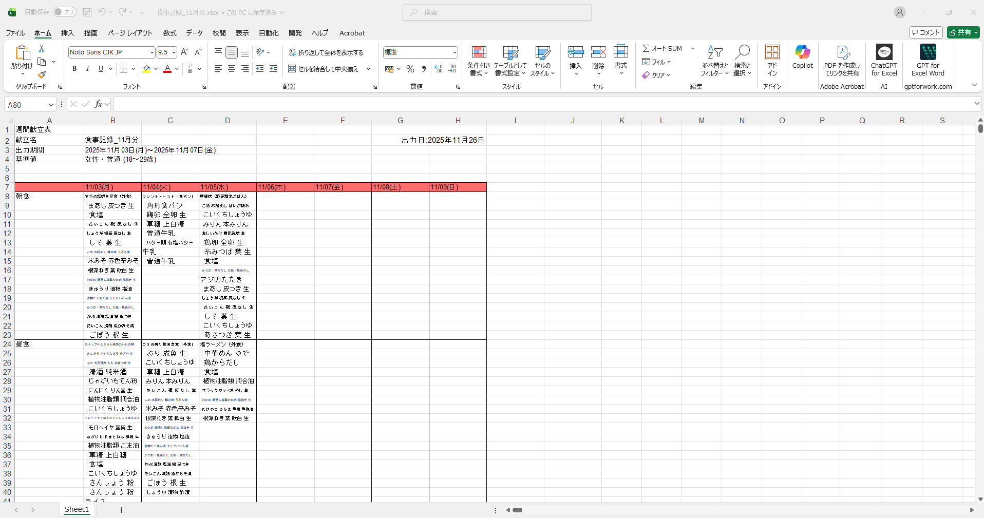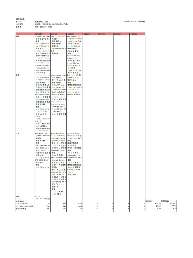 【料理名・食品名を出力/選択栄養素合計/週間平均/期間平均/フォーマット:Excel】を出力した結果