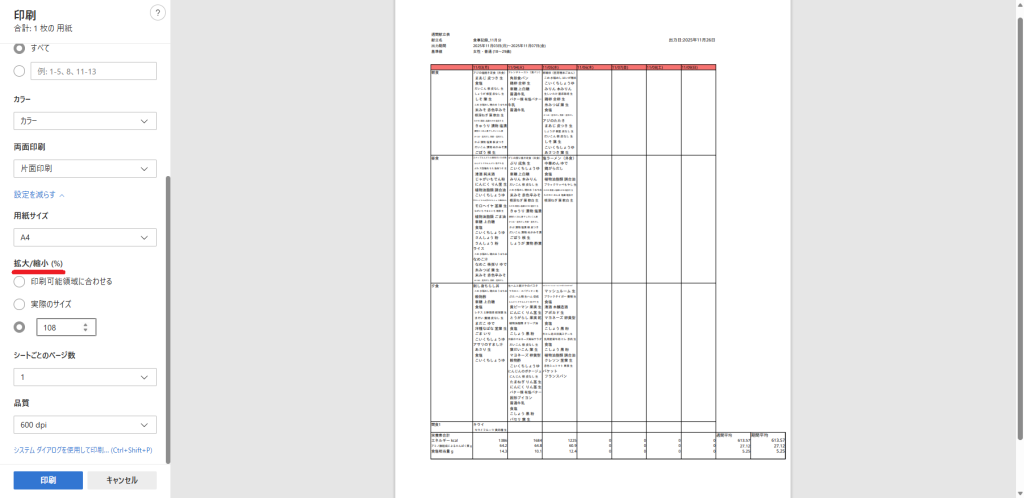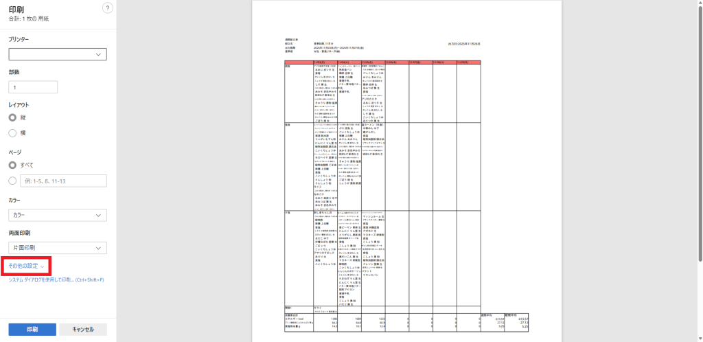 「プリンター」にプリンタを選択することで、印刷をすることができ、PDFを指定すると、ファイルを保存することができます。表示倍率を変更する場合には、「その他の設定」を選択します。
